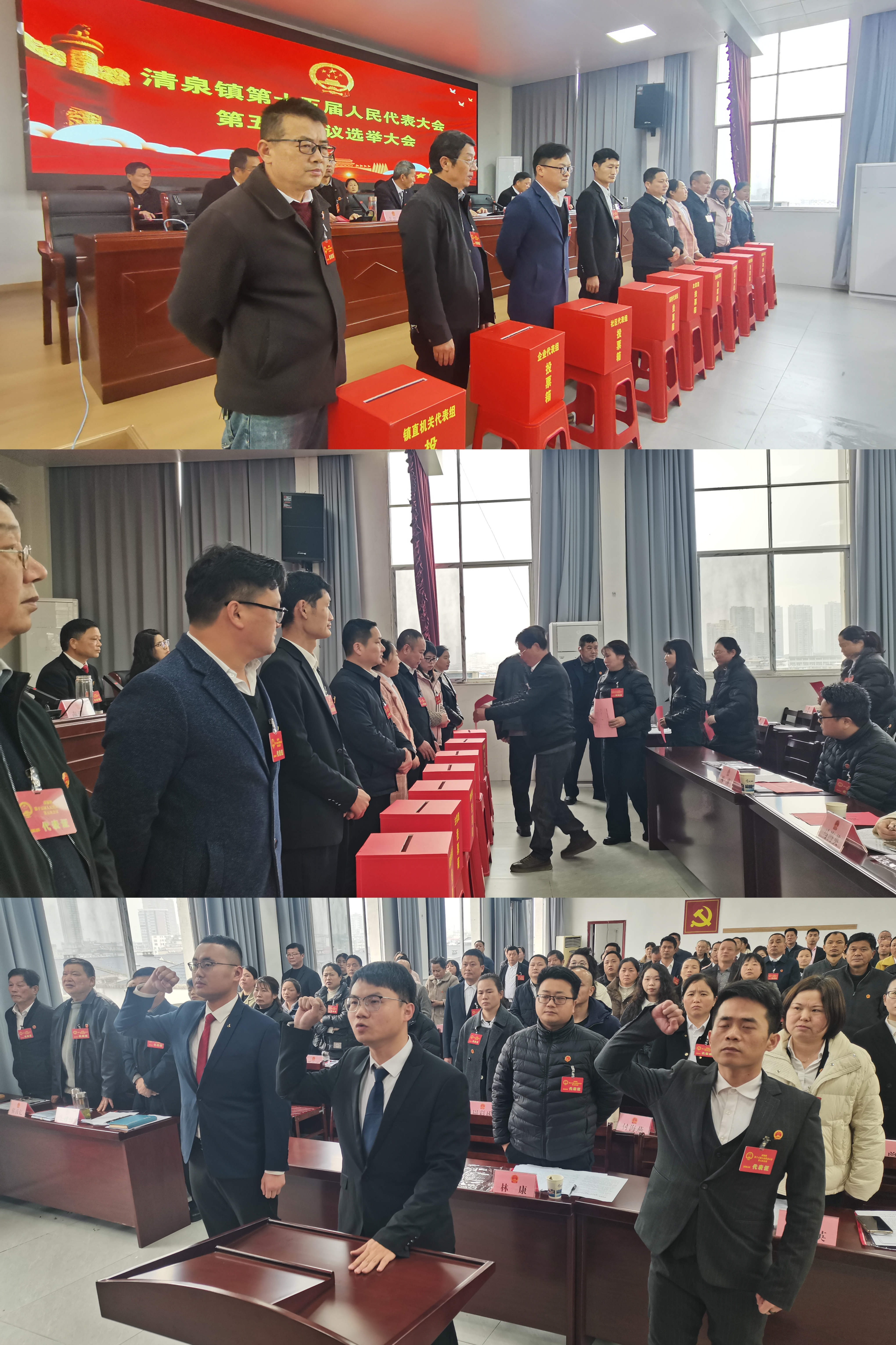 在选举环节,大会依法圆满完成了选举任务,桂江同志全票当选为清泉镇人民政府镇长,张睿轩、彭飞两位同志全票当选为清泉镇人民政府副镇长。